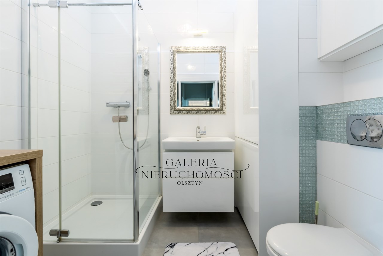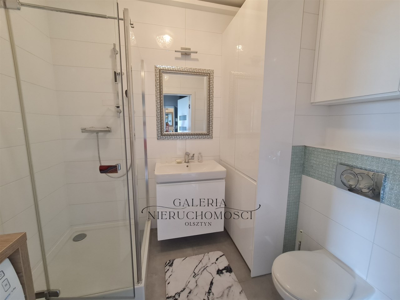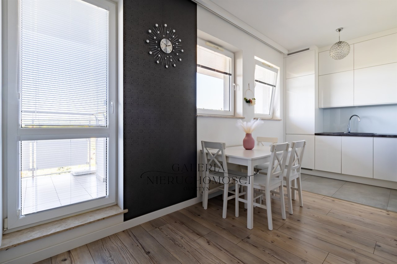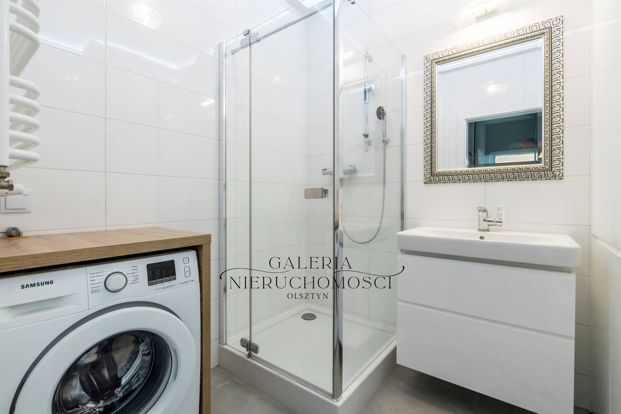 Na wyposażeniu znajduje się zabudowa kuchenna, zmywarka, płyta indukcyjna oraz lodówka, stół z czterema krzesłami. Łazienka z zabudową, prysznicem oraz pralką.