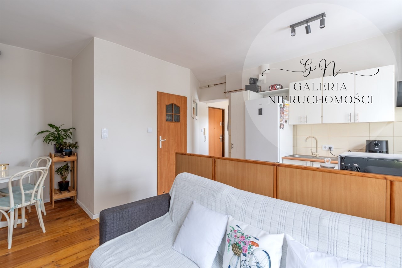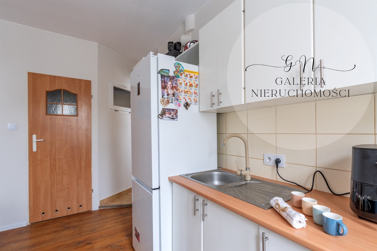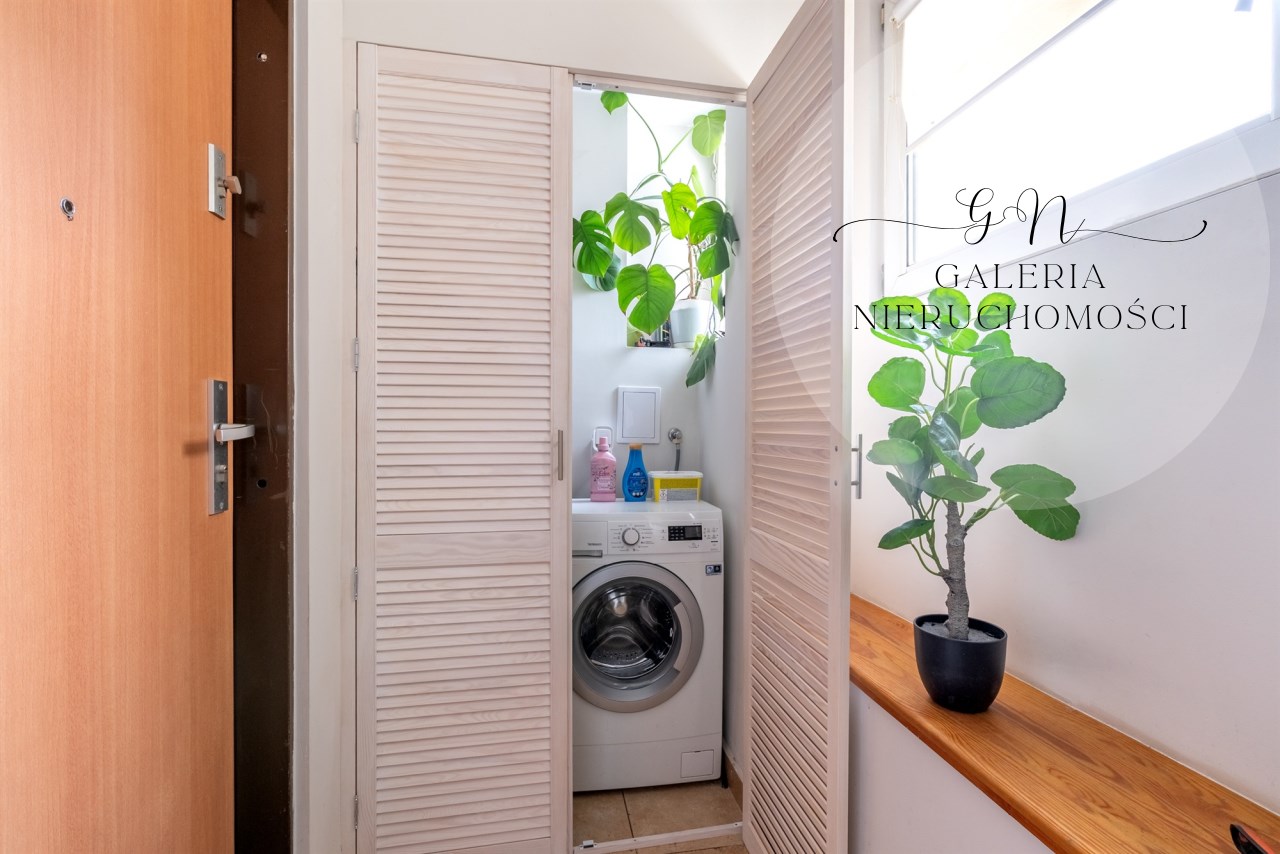 Na powierzchnię użytkową składa się przedpokój z dużą wnęką, pełniącą funkcję pomieszczenia gospodarczego z nowymi drewnianymi drzwiami. Z przedpokoju przechodzimy do słonecznego salonu z aneksem kuchennym oddzielonym barkiem oraz wnęką na stół kuchenny. Z salonu przechodzimy do sypialni z DUŻĄ GARDEROBĄ. Łazienka wyposażona w prysznic.