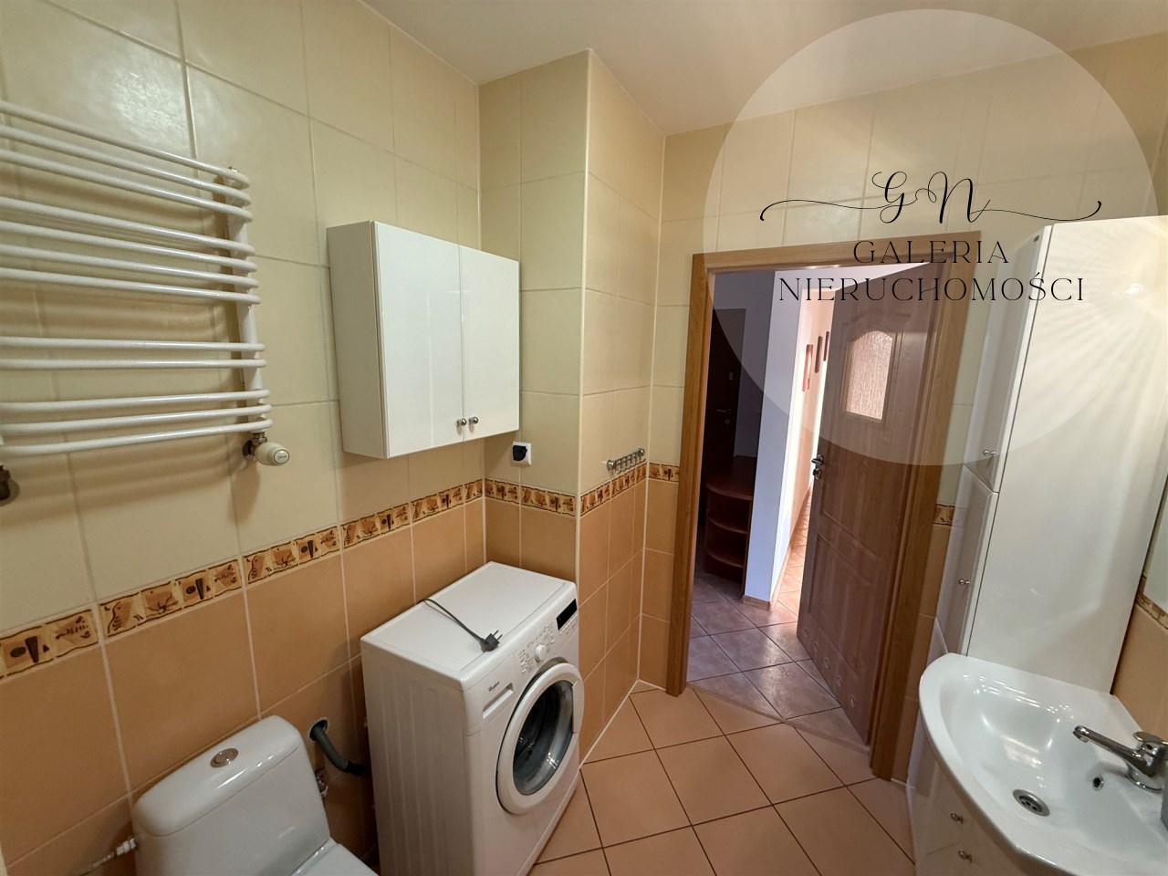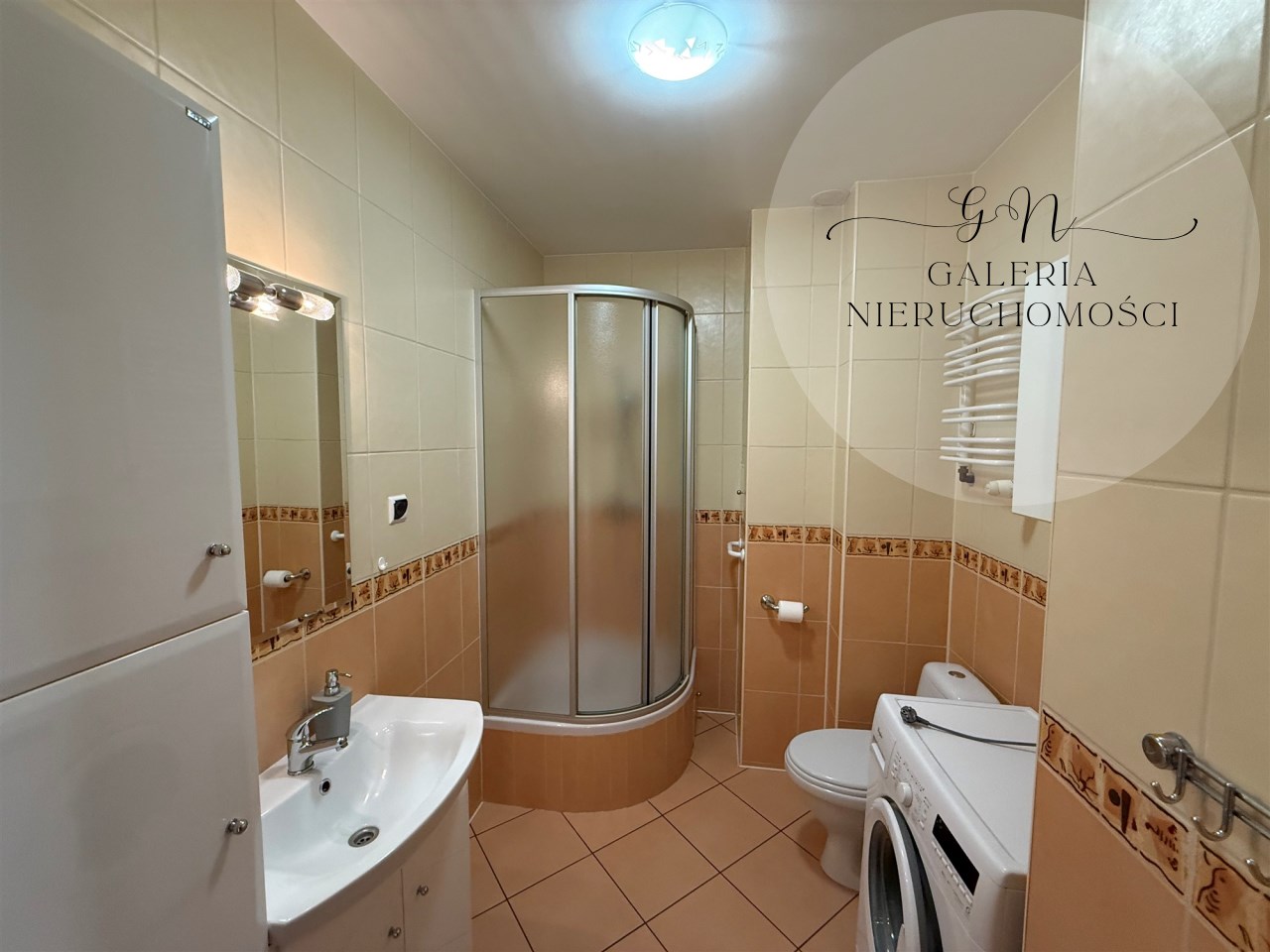 3.Łazienka z prysznicem, pralką i przydatnymi szafkami.