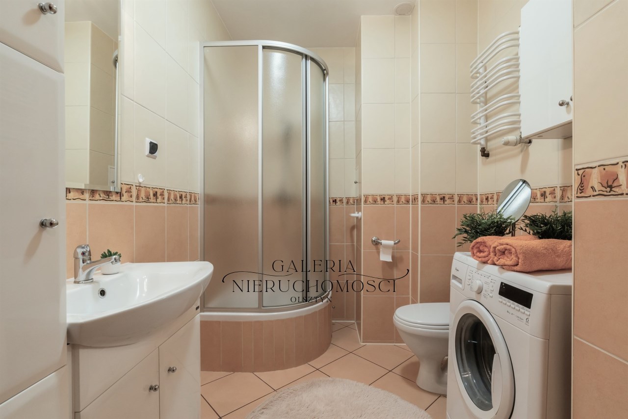 3.Łazienka z prysznicem, pralką i przydatnymi szafkami.